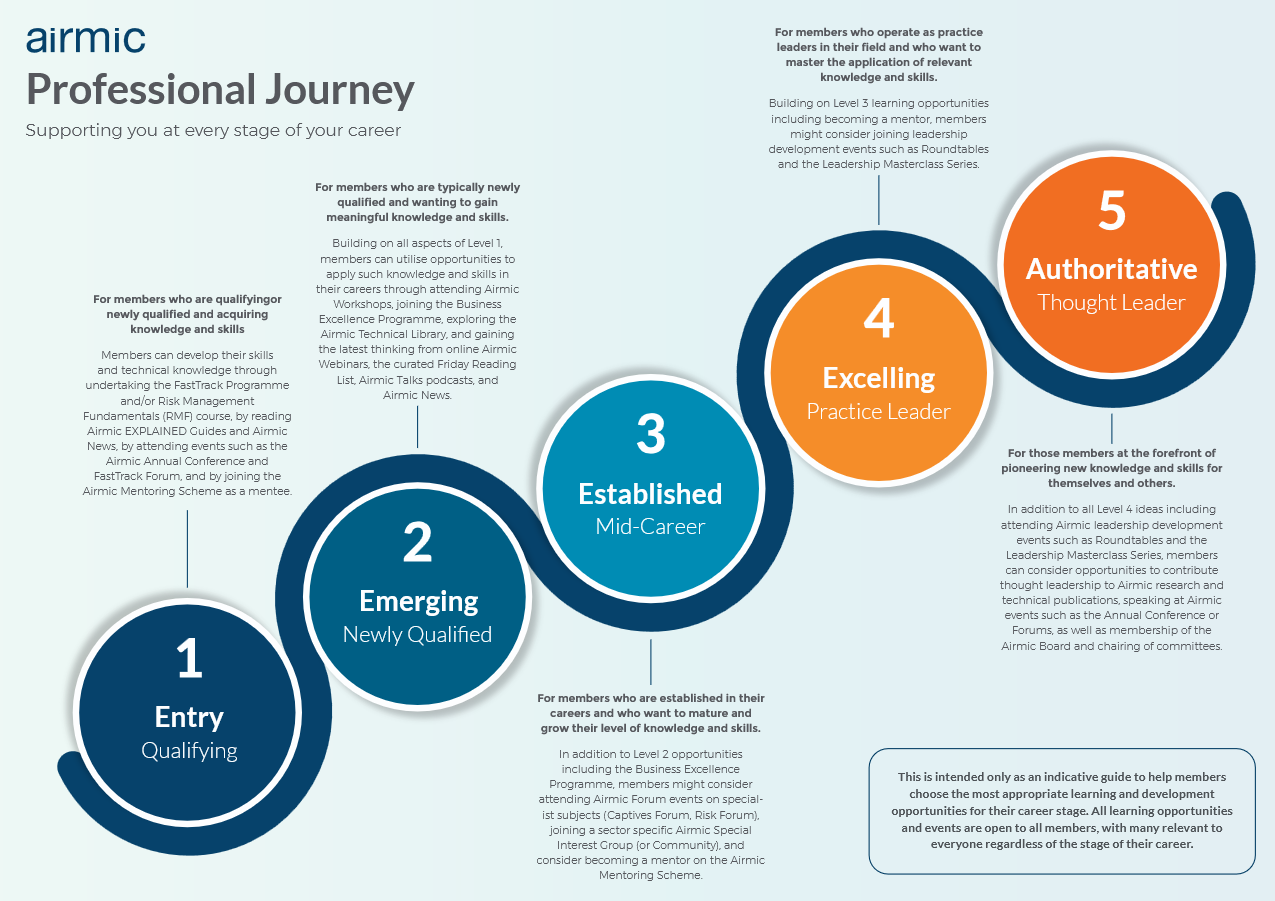 Airmic promotes and supports the planning, undertaking and subsequent recording, of Continuous Professional Development (CPD). Airmic activities offer a range of opportunities to undertake structured and unstructured CPD designed to help professionals build confidence and credibility, adapt to change through continuous skill development, increase productivity, and focus on relevant training and development to support career goals and address gaps in experience, skills and knowledge.